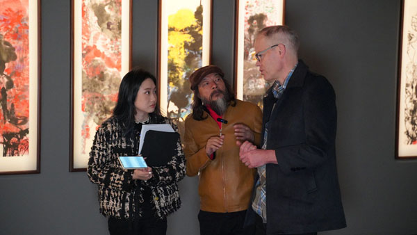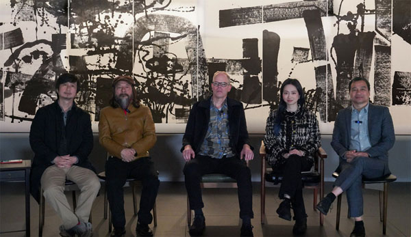 Curt Sanford:在安东先生的作品中,线条的张力与呼吸令我陷入沉思。作为不谙中文的观者,那些游走于抽象与具象间的笔触既令我着迷又困惑 ,在现场看到,有力、柔和的线条,湿润或干燥的笔触。西方字母于我如同透明的容器,承载着确定的语义与发音规则;而安东解构重组的汉字残章,却像装载着五千年文明记忆的黑匣子。这些线条构成的神秘符号,于我而言是纯粹的视觉韵律;但对深谙汉字基因的观者而言,或许每道顿挫都暗藏甲骨裂纹的远古回响。